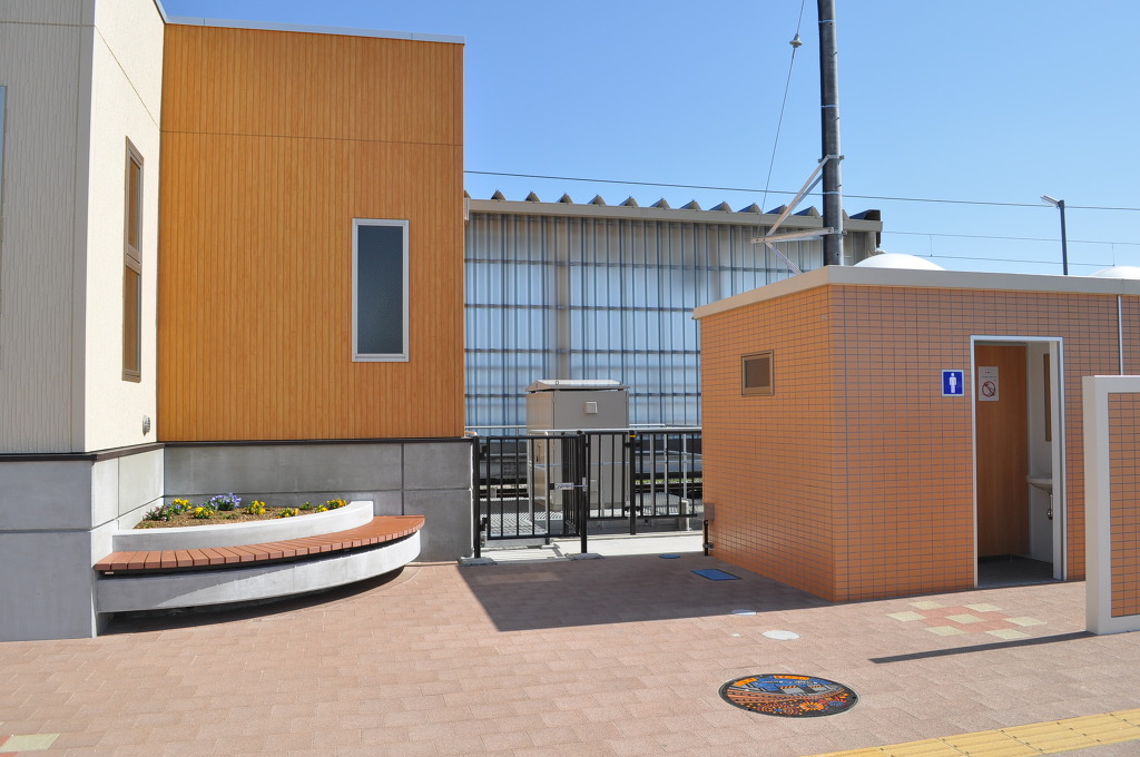 [역 밖에서 역의 전체 구도를 담아 사진 촬영을 해 봅니다. 오른쪽에 보이는 짙은 베이지색 낮은 건물은 화장실입니다]