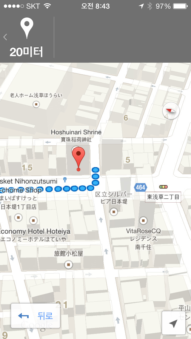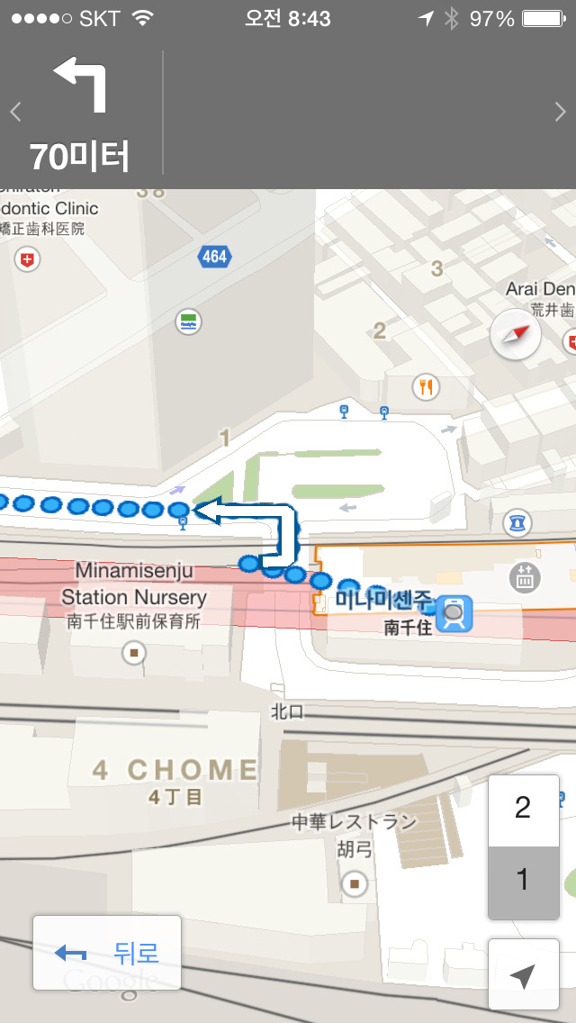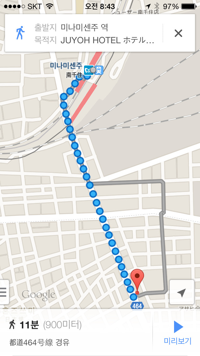 주요호텔 가는길 작성자Series E7|작성시간14.09.06|조회수40 목록 댓글 1 글자크기 작게가 글자크기 크게가 안녕하십니까? Series E7입니다.질문하신 내용에 답변 드립니다.미나미센쥬 역에 내리시면, 서쪽 출구로 나가시면 됩니다. 이어서, 앞에 보이는 큰 도로(464번 국도)를 따라서 주요호텔이 도로 왼쪽에 보일 때까지 도보로 이동하시면 됩니다.지도를 첨부해 드리겠습니다.허접한 답변 읽어 주셔서 감사합니다.도움이 되었는지는 모르겠습니다만... 다음검색 현재 게시글 추가 기능 열기 북마크 공유하기 신고 센터로 신고 댓글 댓글 1 댓글쓰기 답글쓰기 댓글 리스트 작성자Series E7 작성자 본인 여부 작성자 | 작성시간 14.09.06 참고로, 아이폰을 가지고 계신다면애플 지도를 사용하시는 것이 구글 지도보다 낫습니다. 제가 가고시마에서 구글 지도를 사용해 봤지만, 내비게이션이 엉뚱한 gps 위치를 잡고 있었습니다. 반면에 애플 지도는 현위치를 바로 잡았습니다.너무 글이 길었나요...?길었다면 죄송합니다...어쨌든, 좋은 여행 되세요!! 댓글 전체보기