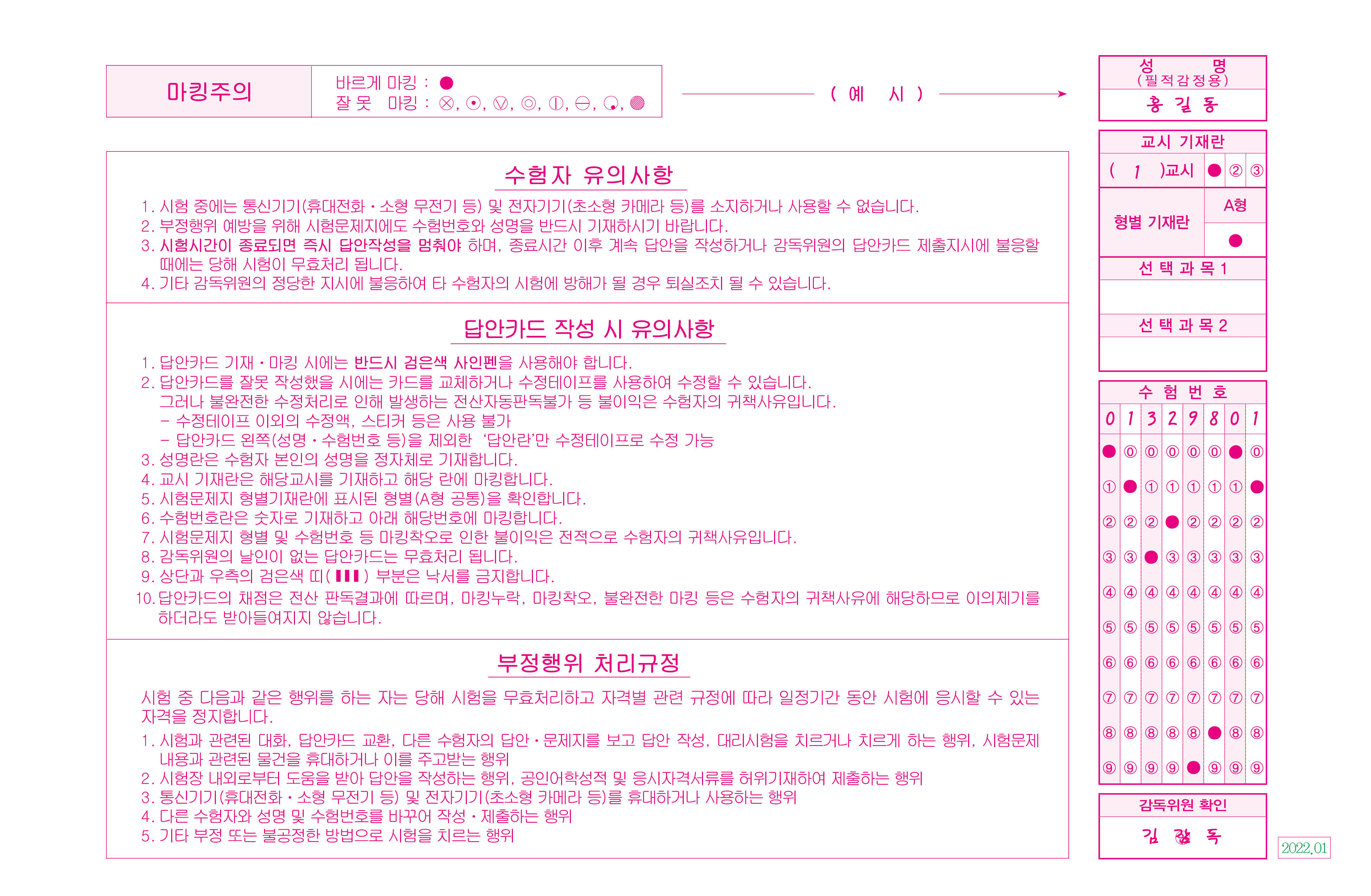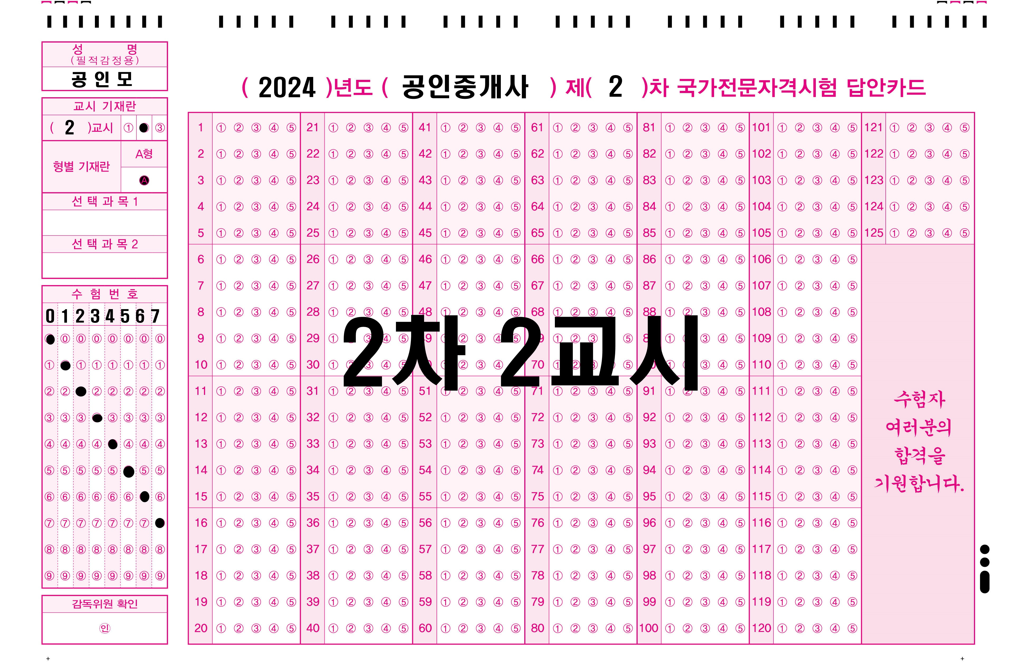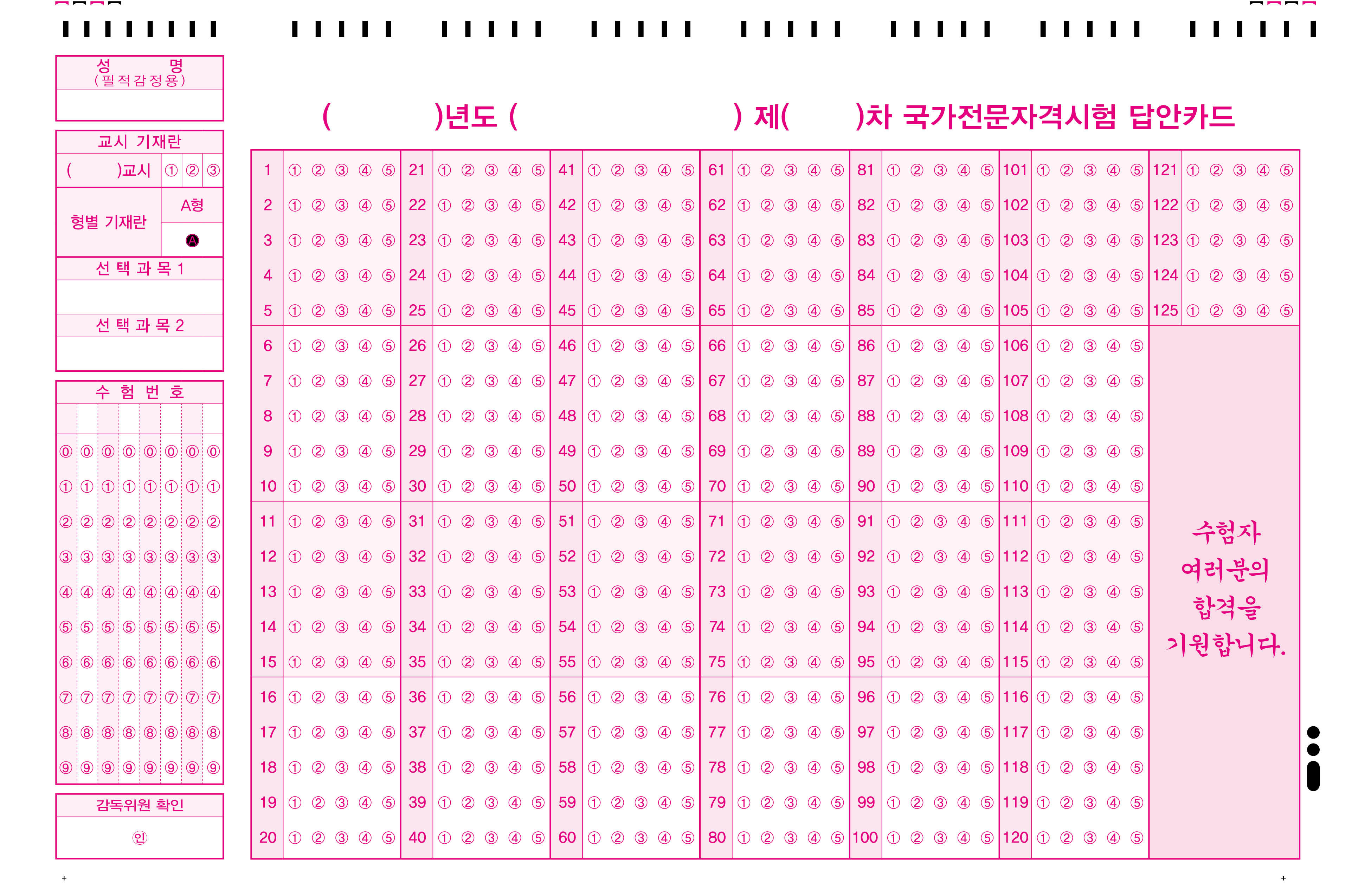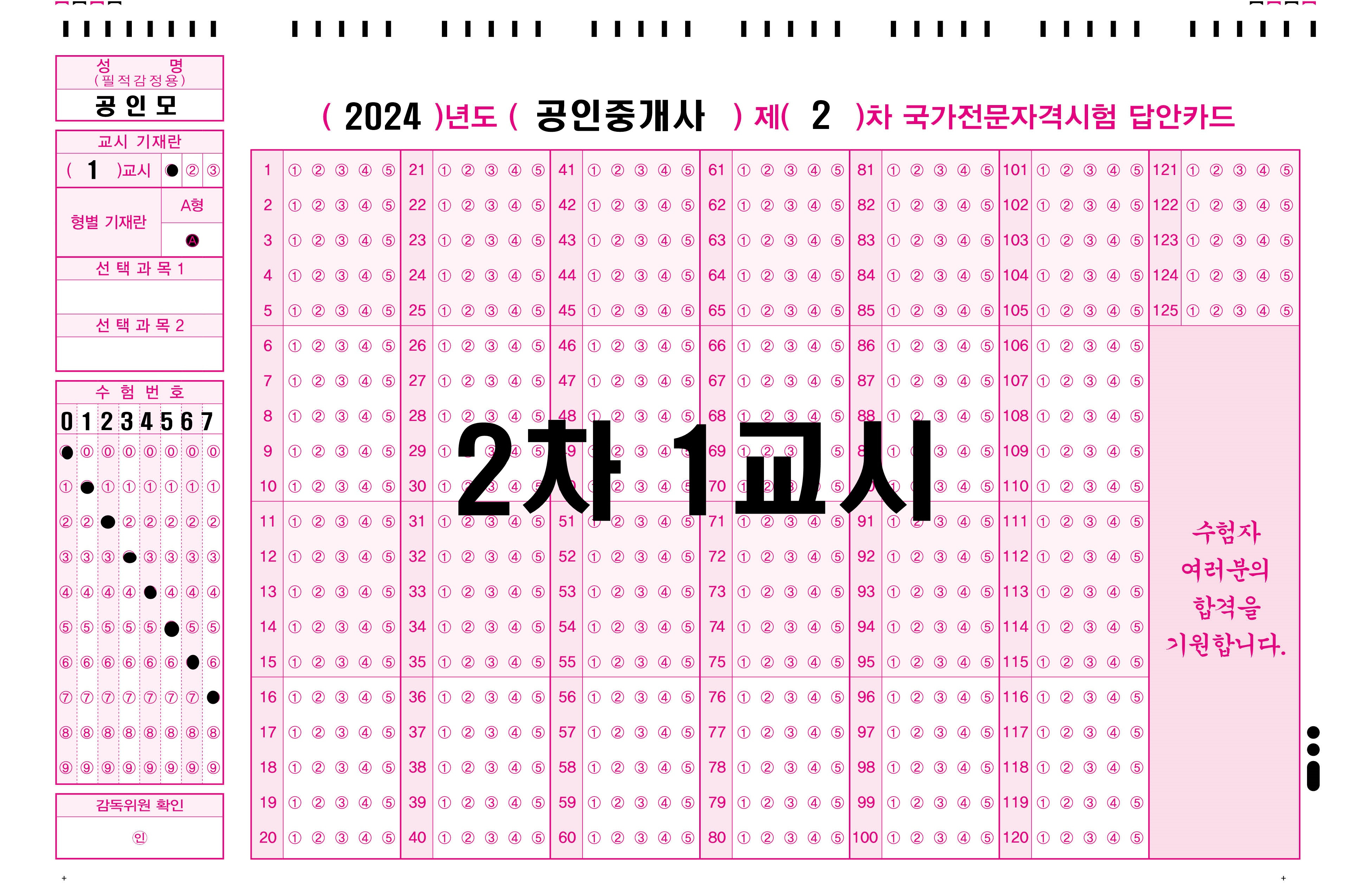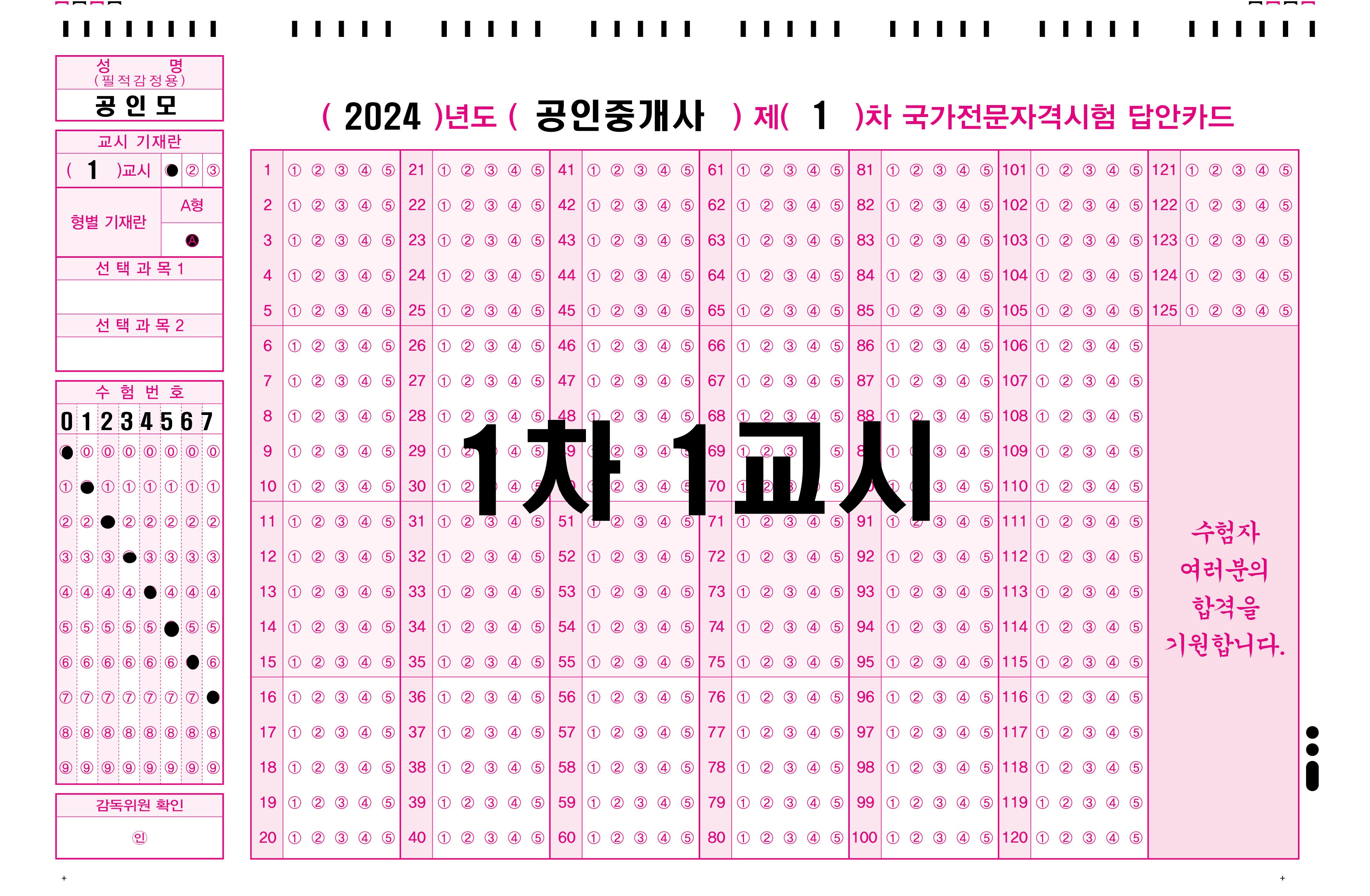국가전문자격시험 공통 OCR답안카드(객관식) 견본 및 작성 예시 작성자새로미|작성시간24.10.22|조회수85 목록 댓글 0 글자크기 작게가 글자크기 크게가 국가전문자격시험 공통 OCR답안카드(5지 125문형) 견본을 공개합니다. 작성 예 다음검색 현재 게시글 추가 기능 열기 북마크 공유하기 신고 센터로 신고 댓글 댓글 0 댓글쓰기 답글쓰기 댓글 리스트