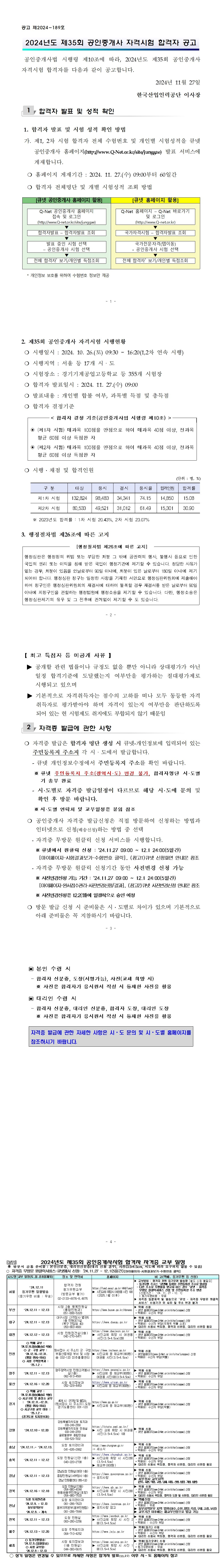 공인중개사법 시행령 제10조에 따라, 2024년도 제35회 공인중개사 자격시험 합격자를 다음과 같이 공고합니다.