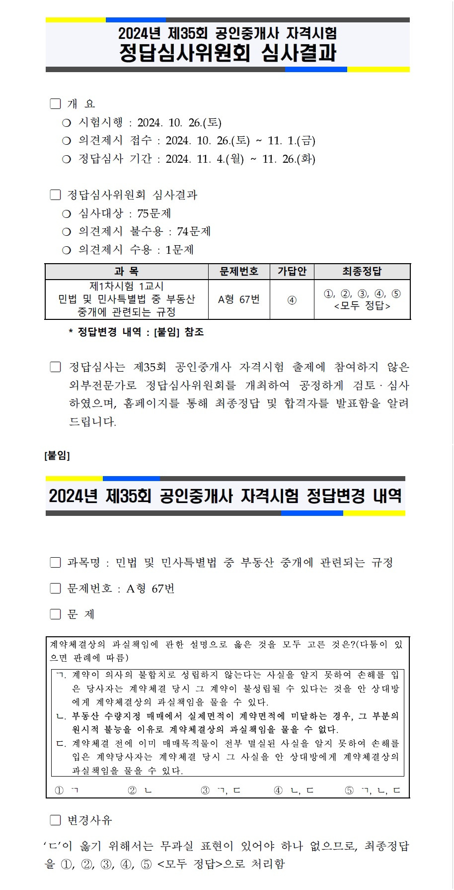 2024년 제35회 공인중개사 자격시험 정답심사위원회 심사결과 작성자새로미|작성시간24.11.27|조회수139 목록 댓글 0 글자크기 작게가 글자크기 크게가 2024년 제35회 공인중개사 자격시험 정답심사위원회 심사결과를 첨부파일과 같이 알려드립니다. 2024년 제35회 공인중개사 자격시험 정답심사위원회 심사결과.pdf136.06KB 첨부파일첨부된 파일이 2개 있습니다. jpg 파일 1-vert.jpg 다운로드 pdf 파일 2024년 제35회 공인중개사 자격시험 정답심사위원회 심사결과.pdf 다운로드 다음검색 현재 게시글 추가 기능 열기 북마크 공유하기 신고 센터로 신고 댓글 댓글 0 댓글쓰기 답글쓰기 댓글 리스트