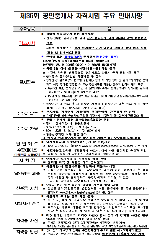 2025년도 공인중개사 주요 안내사항 작성자새로미|작성시간25.07.29|조회수113 목록 댓글 0 글자크기 작게가 글자크기 크게가 2025년 공인중개사 주요 안내사항(큐넷공지용).hwp82.50KB큐넷바로가기 첨부파일첨부된 파일이 2개 있습니다. png 파일 안내사항.png 다운로드 hwp 파일 2025년 공인중개사 주요 안내사항(큐넷공지용).hwp 다운로드 다음검색 현재 게시글 추가 기능 열기 북마크 공유하기 신고 센터로 신고 댓글 댓글 0 댓글쓰기 답글쓰기 댓글 리스트