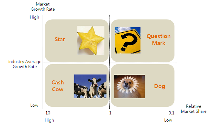 - Question Mark: 성장률은 상당히 높은 시장에서 점유율은 낮은 사업분야입니다. 아직 돈이 되진 않지만 상당히 매력적인 시장이죠. 하지만 대규모의 투자가 필요하기 때문에 이 중 일부는 투자를 통해 Star로 키우고, 일부는 포기해야합니다.