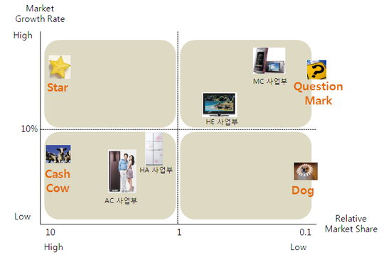 이렇게 산출해서 matrix에 나타내본 결과, 이상하게도 현재 LG전자에서 가장 큰 매출의 비중을 차지하는 MC와 HE가 Question Mark에 위치하게 되는 현상이 나타났네요 ^^ 하지만 다시 생각해보면 이상할 것이 없는게, 워낙 큰 경쟁자들이 있고 기술이 빠르게 발전하면서 성장률도 높으니 저렇게 나타나는게 당연한 것 같아요. 그리고 LG전자의 입장에서는 저 둘의 시장점유율을 높여 Star로 보내는 전략을 세워야겠죠^^