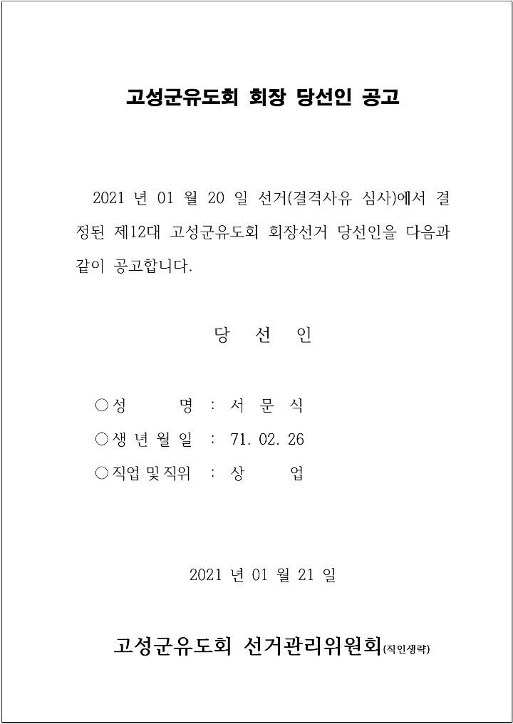고성군유도회 회장 당선인 공고 작성자judo마니아|작성시간21.01.21|조회수199 목록 댓글 0 글자크기 작게가 글자크기 크게가 회장 당선인 공고고성군유도회 선거관리위원회의 절차에 따라 회장당선인을 공고합니다.#고성유도관 다음검색 현재 게시글 추가 기능 열기 북마크 신고 센터로 신고 댓글 댓글 0 댓글쓰기 답글쓰기 댓글 리스트