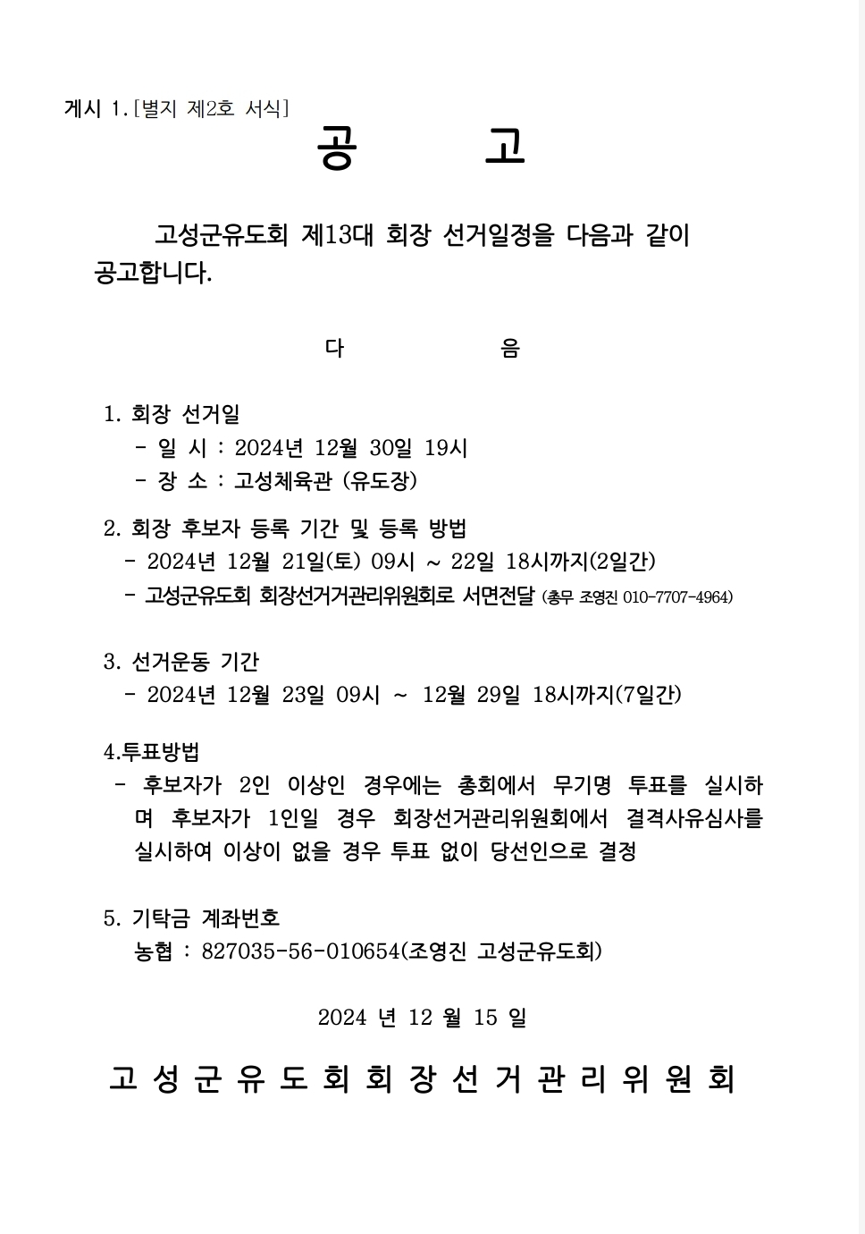 제13대 고성군유도회 회장 선거공고 작성자judo마니아|작성시간24.12.16|조회수94 목록 댓글 0 글자크기 작게가 글자크기 크게가 2. 선관위 1차회의 공고(게시 내용).pdf366.76KB 첨부파일첨부된 파일이 2개 있습니다. jpg 파일 Screenshot_20241216_150011_Polaris Office.jpg 다운로드 pdf 파일 2. 선관위 1차회의 공고(게시 내용).pdf 다운로드 다음검색 현재 게시글 추가 기능 열기 북마크 신고 센터로 신고 댓글 댓글 0 댓글쓰기 답글쓰기 댓글 리스트