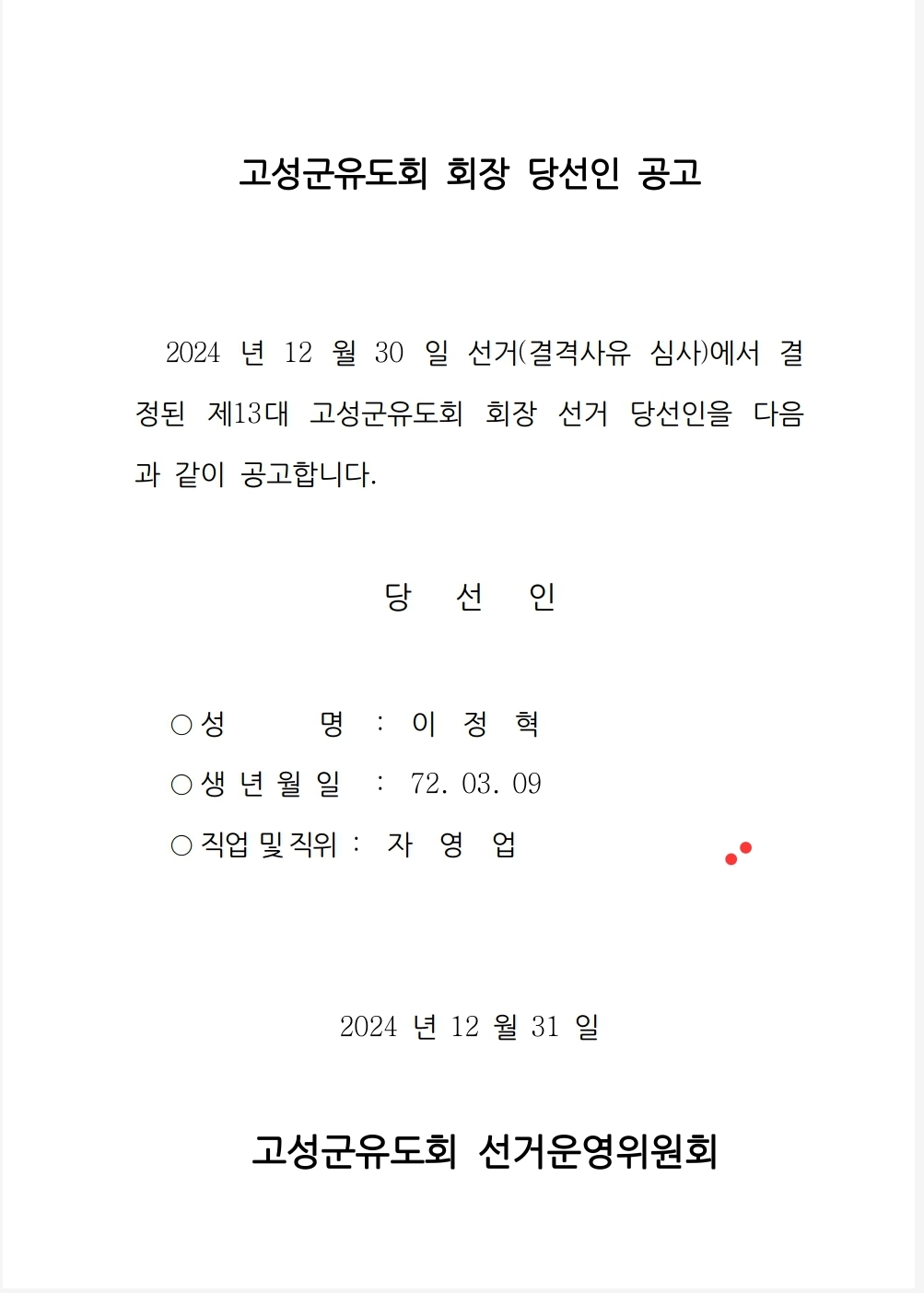 고성군유도회 회장 당선인공고 작성자judo마니아|작성시간25.01.02|조회수196 목록 댓글 0 글자크기 작게가 글자크기 크게가 다음검색 현재 게시글 추가 기능 열기 북마크 신고 센터로 신고 댓글 댓글 0 댓글쓰기 답글쓰기 댓글 리스트