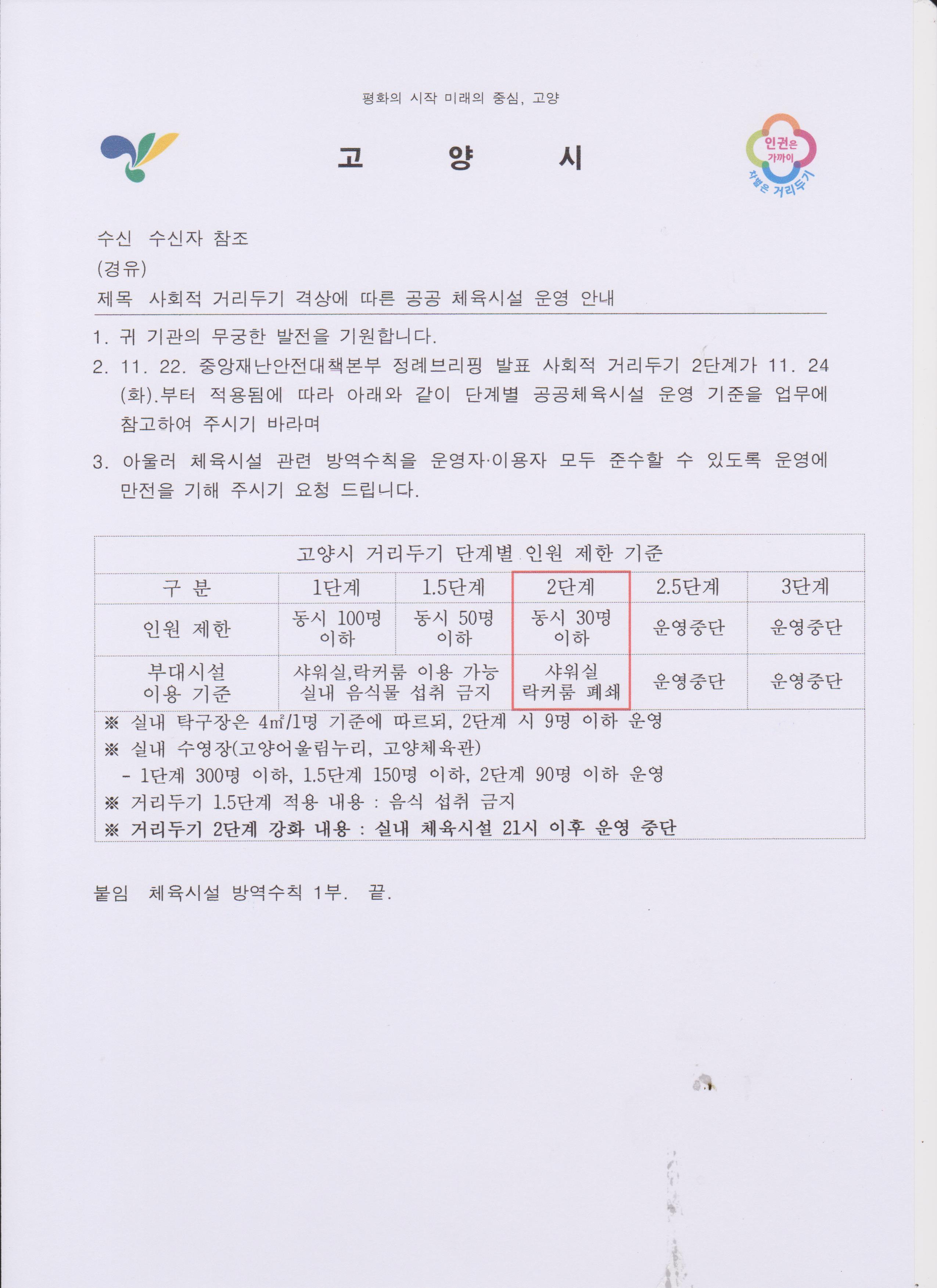 코로나19 2단계 격상에따른 실내연습장 이용수칙 작성자사무국장|작성시간20.11.26|조회수267 목록 댓글 0 글자크기 작게가 글자크기 크게가 이용회원 및 단체는 필히 마스크를 착용하시고 아래사항을 받듯이 지켜주시기 바랍니다. 다음검색 현재 게시글 추가 기능 열기 북마크 공유하기 신고 센터로 신고 댓글 댓글 0 댓글쓰기 답글쓰기 댓글 리스트