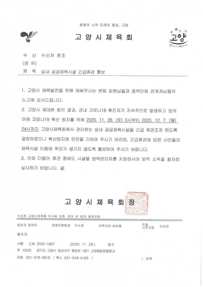 고양시 지역에 코로나19집단 감염이 많이 발생하여 추가 지역 사회 감염을 막기 위해 고양시 관내 실내공공체육시설 긴급 휴관 결정이 내려졌습니다. 참고하시기 바랍니다.