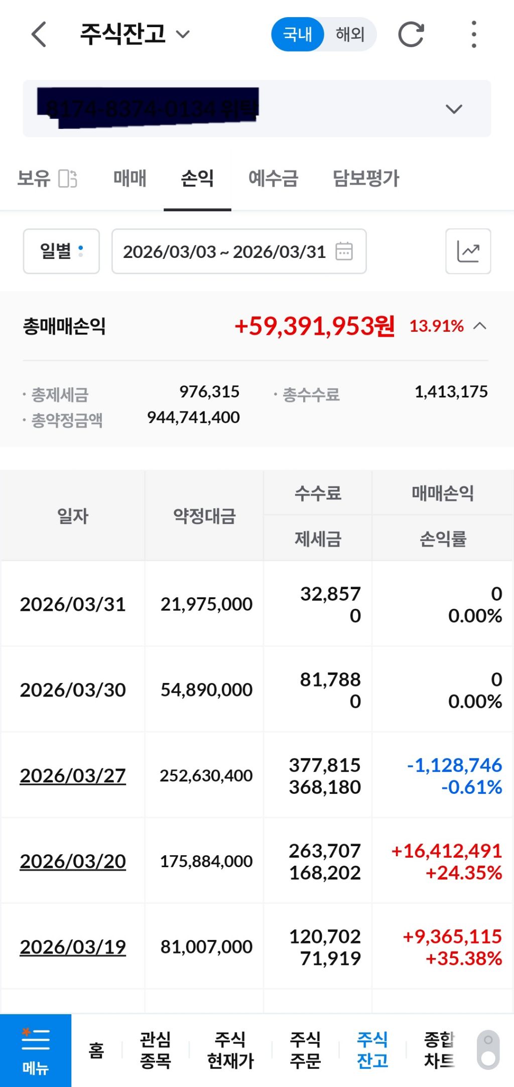 3월 수익인증 작성자김영수|작성시간26.03.31|조회수97 목록 댓글 9 글자크기 작게가 글자크기 크게가 전쟁으로 수익종목들 빨리 수익 실현 했습니다 월 목표는 달성 했쓰나 계좌는 지하실에 가 있네요흔들리는 마음과 정신 잡아주시는 백곰사령관님 해리정님 종가랠라님 감사합니다 이 또한 지나가리라 다음검색 현재 게시글 추가 기능 열기 북마크 공유하기 신고 센터로 신고 댓글 댓글 9 댓글쓰기 답글쓰기 댓글 리스트 작성자레티시아 | 작성시간 26.04.01 김영수님 수익 축하드립니다! 작성자황금토끼 | 작성시간 26.04.01 어려운 장에 수익 축하드립니다.^^ 작성자백프로 | 작성시간 26.04.01 와우^^♡♡ 축하드려요. 작성자초승달과 밤배 | 작성시간 26.04.01 역시 김영수님 지난달에도 큰수익 내셨네요축하드립니다! 작성자둘셋_0613 | 작성시간 26.04.01 와~~3월 전쟁장에서 수익이라뇨...축하합니다!!! 댓글 전체보기