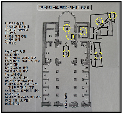 이 천사들의 성모 마리아 대성당에는 세가지 신비가 있다고 합니다. 첫번째 신비는, 성 프란치스코의 성상을 지키고 있는 한상의 비둘기 이고 두번째 신비는 장미향이 나는 복도입니다. 세번째 신비는 가시 없는 장미로 이루어진 장미정원이라고 합니다.