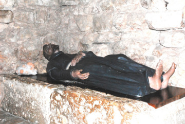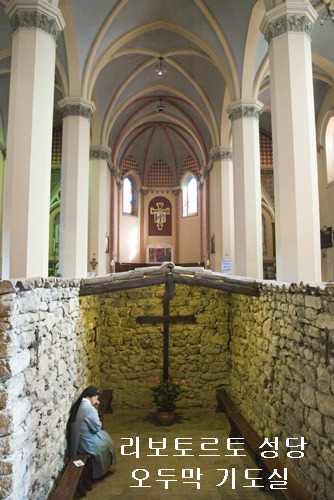 성당 실내 뒤편에 당시 성인이 수도하던 돌로 만든 움막이 보존돼 있다.