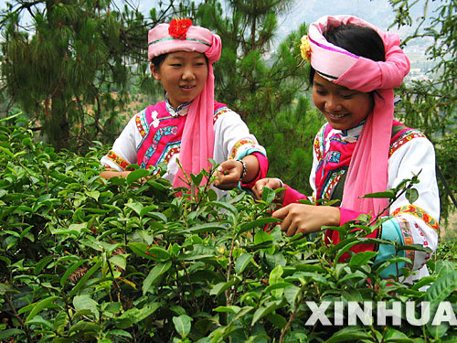 위의 사진은 린창지역의 차나무에서 잎을 따는 사진,