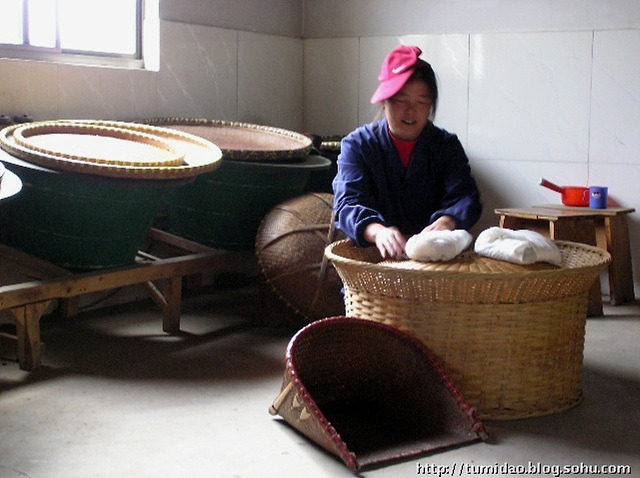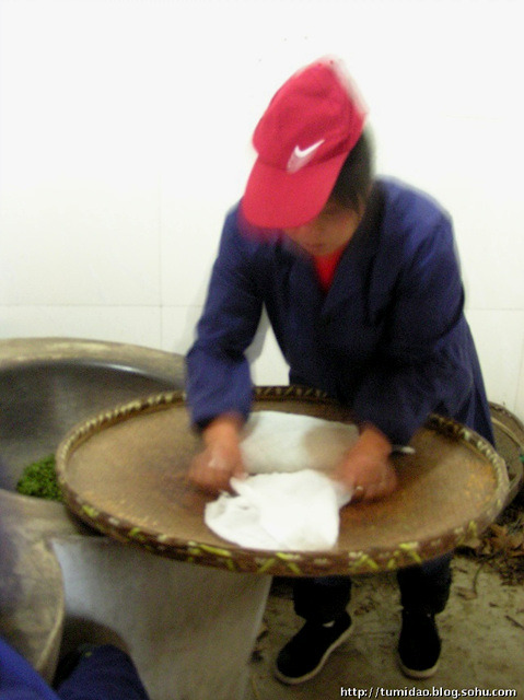 유념을 마친 차는 천으로 잘 싸준 다음 대나무 광주리 위에 두고 작은 광주리로 덮어줍니다.