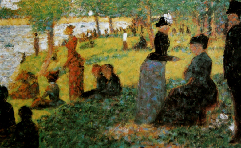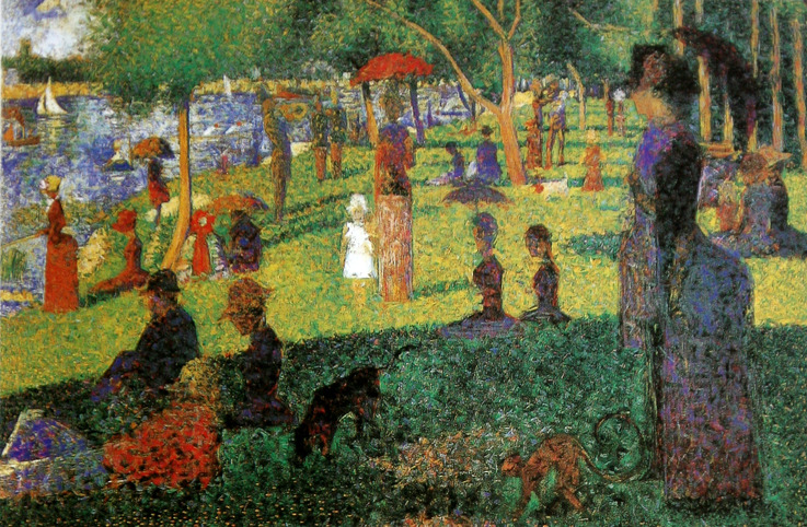 느낌대신 여름날의 일요일 오후를 야외에서 즐기는 당시 파리시민들의 모습을 점묘화법으로 정적이