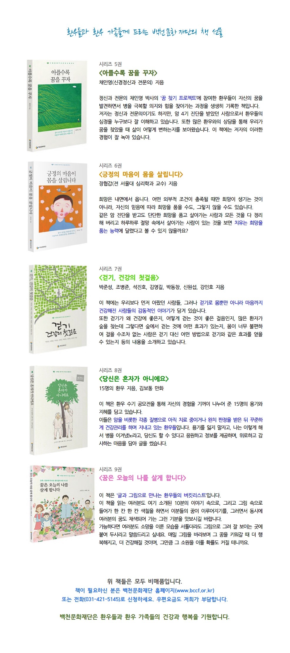 [무료 책 나눔] 환우분들께 책 선물 드립니다~ 작성자백천재단|작성시간16.11.11|조회수9 목록 댓글 1 글자크기 작게가 글자크기 크게가 다음검색 현재 게시글 추가 기능 열기 북마크 공유하기 신고 센터로 신고 댓글 댓글 1 댓글쓰기 답글쓰기 댓글 리스트 작성자백천재단 작성자 본인 여부 작성자 | 작성시간 16.11.11 저희 재단 홈페이지에 오셔서 '사연쓰기' 코너를 이용하시면 회원가입 절차 없이 손쉽게 책을 신청하실 수 있습니다. 댓글 전체보기