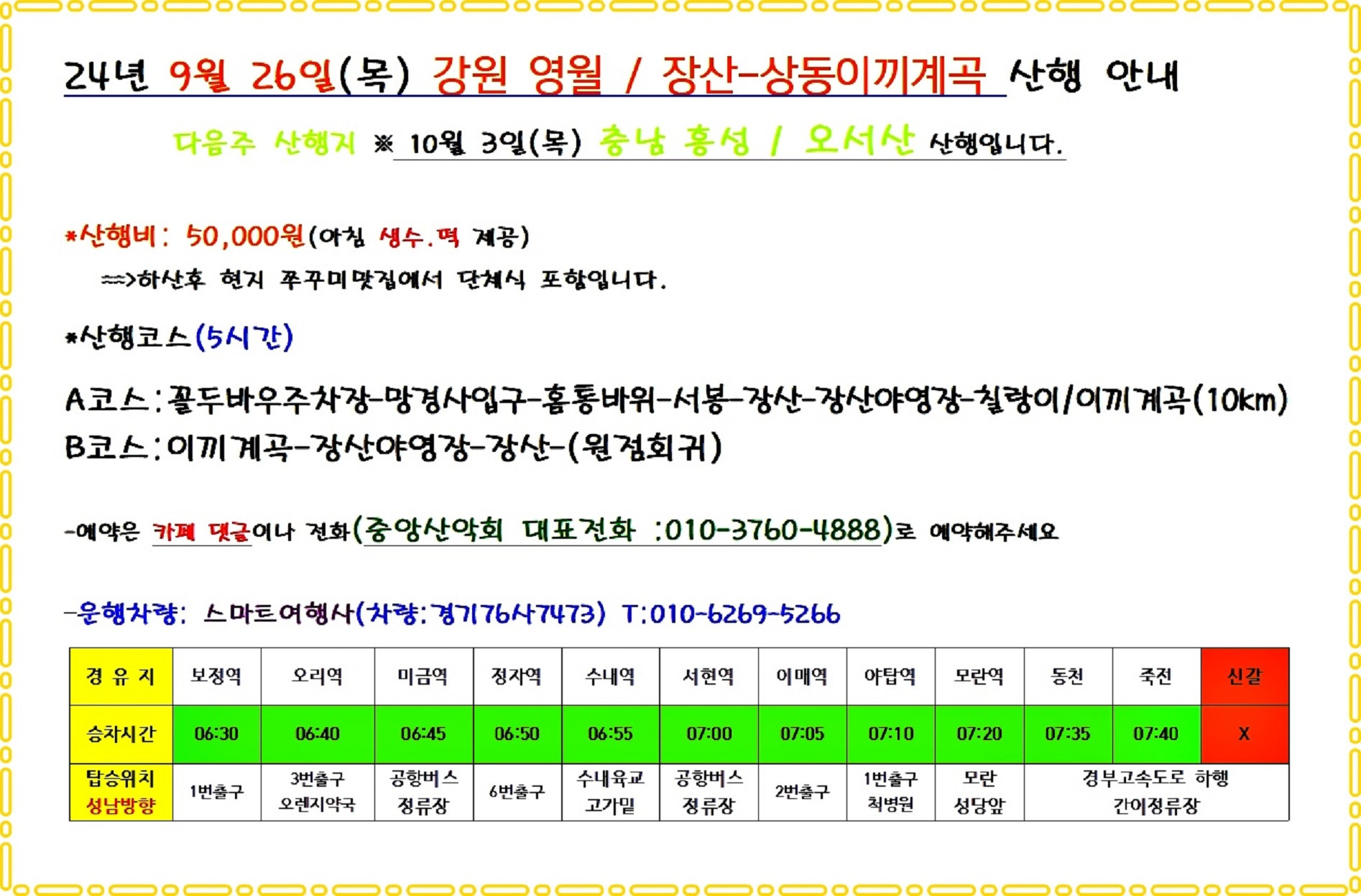 24년 9월 26일 장산 / 상동이끼계곡 (강원 영월) 산행안내입니다.(하산후 현지 쭈꾸미맛집 단체식사 포함합니다.)