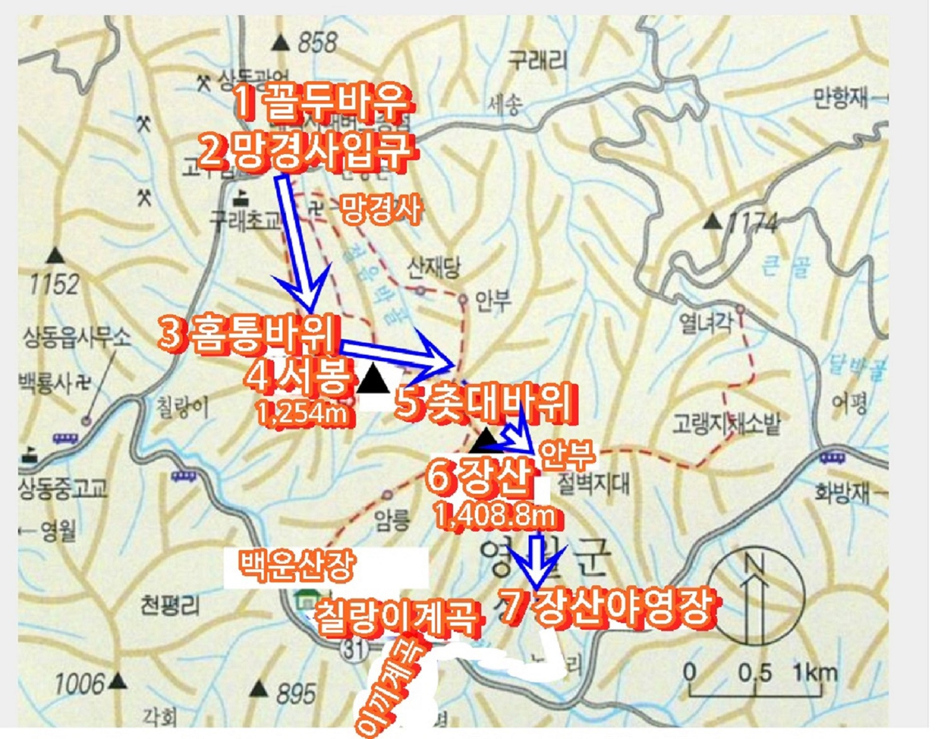 작성자달맞이꽃작성시간24.09.20조회수690 목록 댓글 14▲장산(1,408.8m) 상동읍 구래리와 천평리 사이에 위치하는 산으로 , 백두 대간의 함백산이 서쪽으로 가지를 쳐 웅장하게 솟구친 산으로 남쪽과 서쪽은 바위와 절벽지대로 이루어져 경관이 매우 수려하고, 북쪽과 동쪽은 완사면으로 상동에서 태백 방면으로 가다 칠랑이 골에서 좌측으로 쳐다보면 성벽처럼 그 위용을 자랑하고 있다.