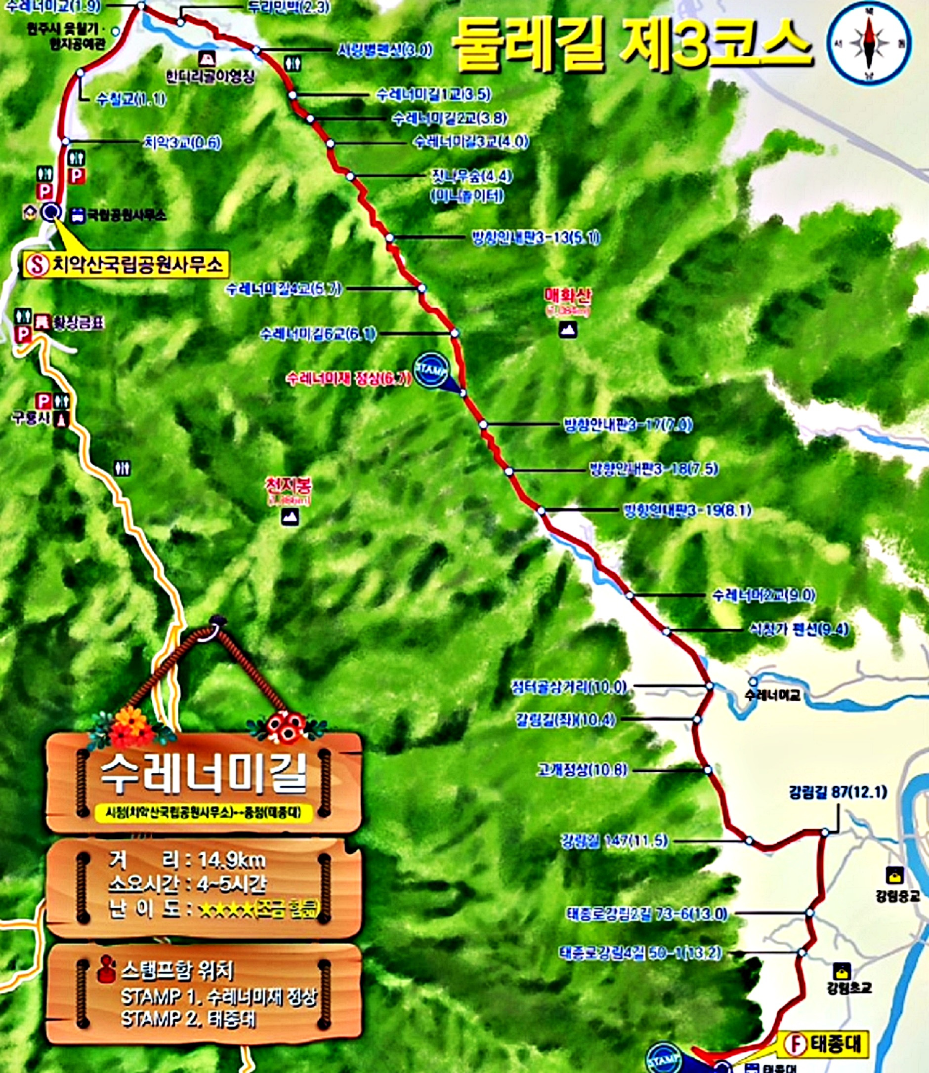 치악산 둘레길 3코스는 수레너미길로 치악산 국립공원관리사무소에서 태종대까지 14.9km로 지난 2006년 건설교통부에 의해 한국의 아름다운 길 100선에 선정됐을 만큼 아름다운 길이다.