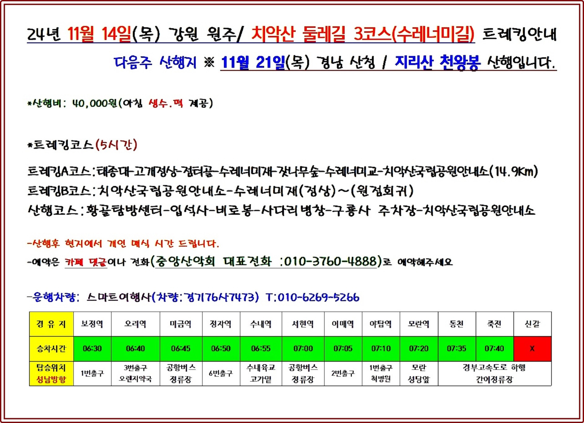작성자竹峴 작성시간 24.11.09 11월 14일 수레너미길 산행에 참석 하겠습니다.