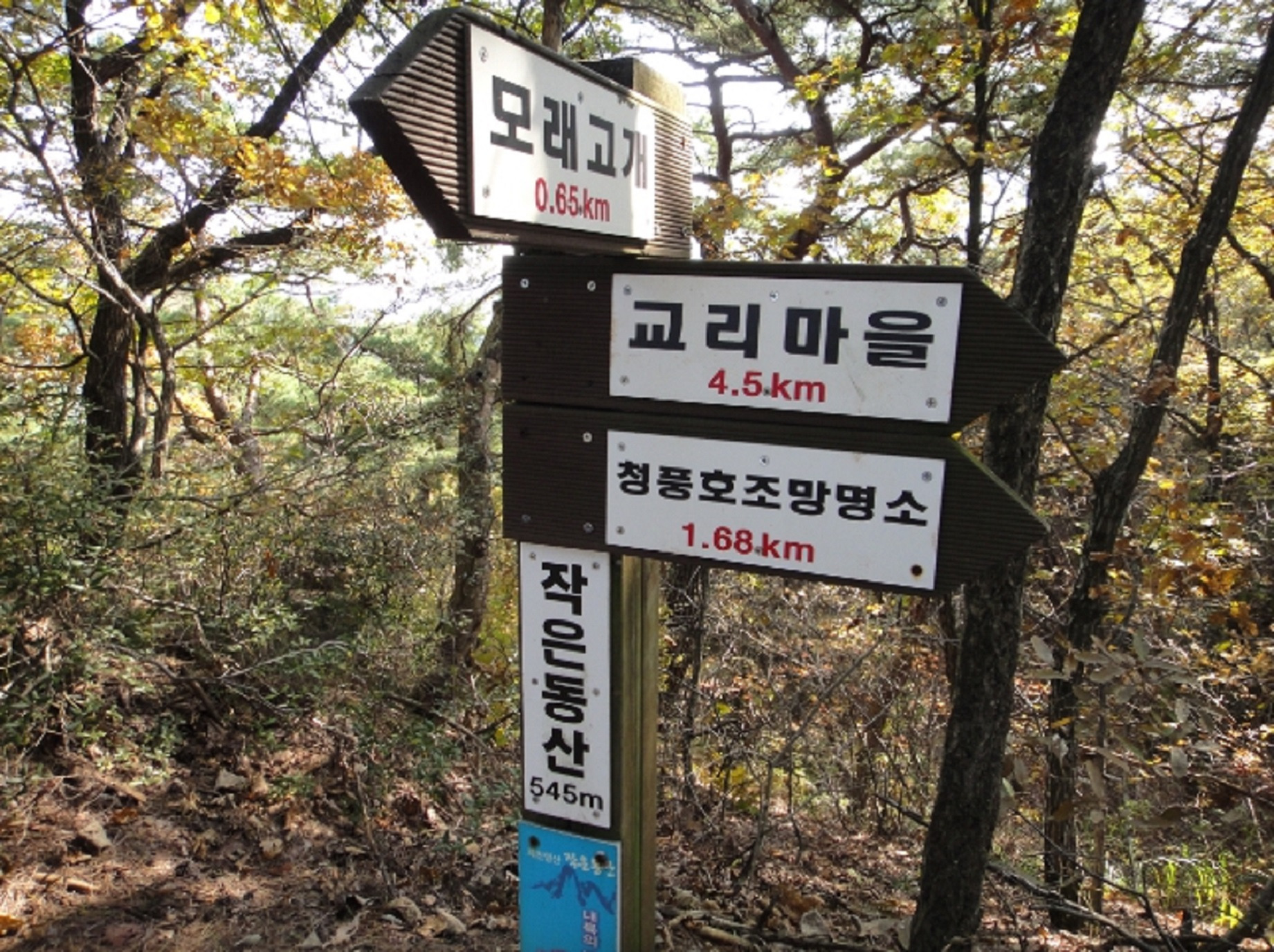 모래재에서 남쪽으로 이어지는 능선이 솟아오른 545m봉을 두고 이곳 주민들은 작은동산이라 부르고 있다. 작은동산은 정상인 545m봉에서 방향을 서쪽으로 바꿔 서서히 고도를 낮추다가 교리와 청풍대교에 이르러 나머지 여맥을 충주호에 가라앉는다.