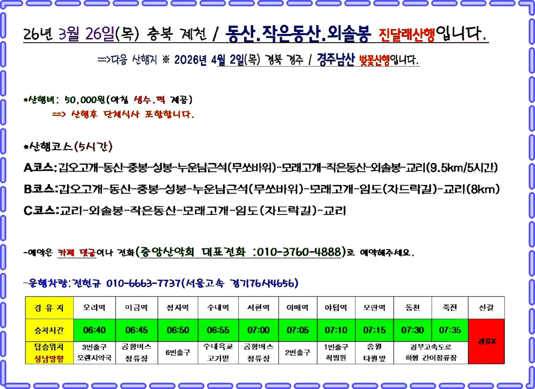 동산ㆍ작은동산 ㆍ외솔봉 동행길 모란탑승 확인하였습니다.