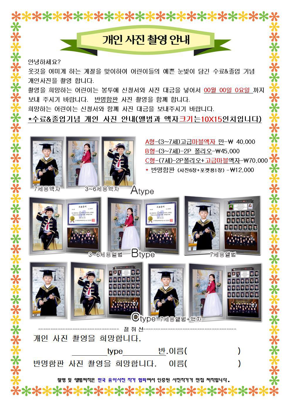 2019 - 3~7세 신청서 작성자김광태 행복한 사진가|작성시간19.10.14|조회수120 목록 댓글 0 글자크기 작게가 글자크기 크게가 3~7세 신청서.hwp 첨부파일첨부된 파일이 2개 있습니다. jpg 파일 3~7세 신청서(증서)001.jpg 다운로드 hwp 파일 3~7세 신청서.hwp 다운로드 다음검색 현재 게시글 추가 기능 열기 북마크 신고 센터로 신고 댓글 댓글 0 댓글쓰기 답글쓰기 댓글 리스트