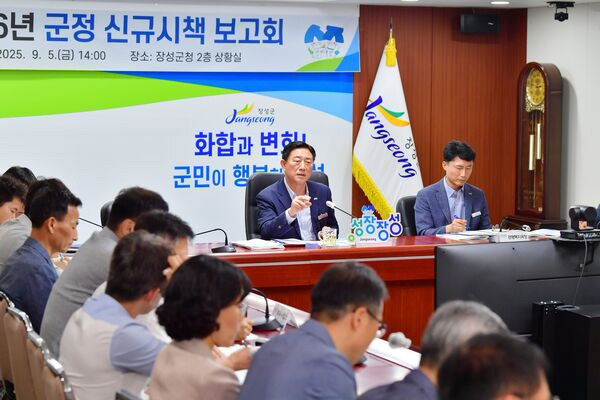 장성군이 지난 5일(금) 군청 상황실에서 ‘2026년 군정 신규시책 보고회’를 가졌다. ‘지속 가능 성장’, ‘군민 행복’, ‘힐링 관광’, ‘스마트 농업’을 견인할 신규·공모사업 145건, 5276억 원 규모 시책이 보고됐다.