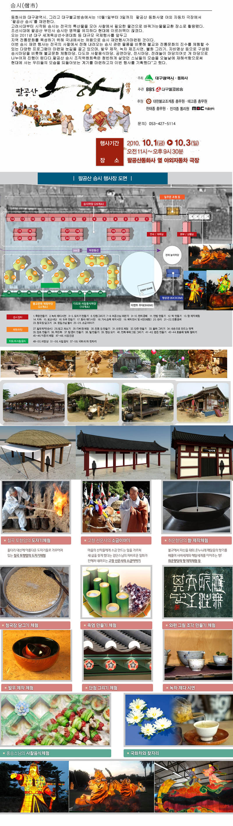 산중 민족문화 큰장터 팔공산 승시(僧市)개최 안내(10월1일-3일) 작성자향기블루스카이|작성시간10.09.24|조회수10 목록 댓글 0 글자크기 작게가 글자크기 크게가 산중 민족문화 큰장터 팔공산 승시(僧市)개최 안내(10월1일-3일) 가족들과 함께 방문하세요.학생들이 민족문화의 우수성을 확인할수 있는60여가지의 전통문화를 체험할수 있습니다. 다음검색 현재 게시글 추가 기능 열기 북마크 공유하기 신고 센터로 신고 댓글 댓글 0 댓글쓰기 답글쓰기 댓글 리스트