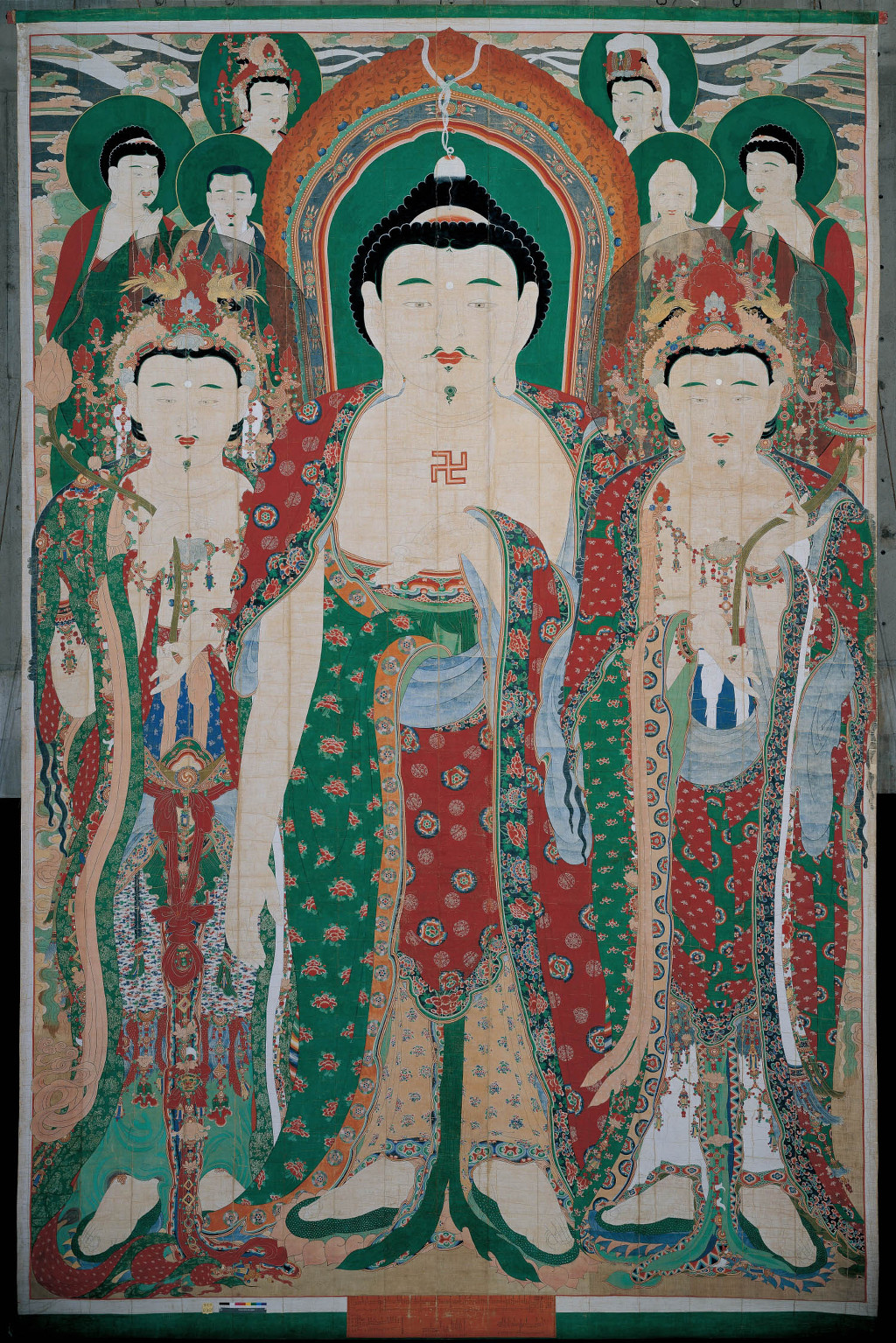 그림의 구도를 보면, 본존불인 석가를 중심으로 좌우에 문수,보현 보살이 배치되어 있다. 화면 중심에 꽉 차게 배치되어 있는 석가여래상은 얼굴이 둥글고 풍만한 모습에 상체는 짧지만 당당하고 우람하게 표현되었다. 두 어깨에 걸친 옷은 두터운 편이다. 옷은 붉은색과 녹색으로 채색하였고 옷깃에도 변화를 주었으며 전면에 걸친 꽃무늬 장식이 밝고 선명해 보인다.