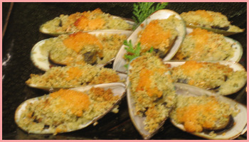 4. 홍합위에 (3)의 재료를 올리고 날치알을 얹은후 예열된 180도의 오븐에서 10분간
