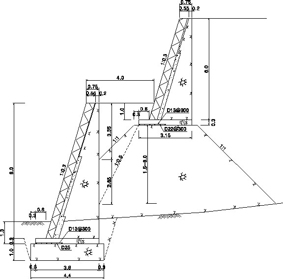 석축의 높이가 8m에 기초폭을 3.75m로 하고 두께가 30㎝인 철근콘크리트 기초판 위에 깬돌 석축을 쌓으면서, 뒤채임을 석축 이면의 기초판 끝에서 수직으로 쇄석을 채웠다. 구조상으로 보아서는 배수 기능이 좋고, 일체는 아니더라도 석축 단면이 육중해 보였고, 넓은 석축면 중에 균열이 2-3개소 있었으나 위험스럽지 않은 미세 균열이었다. 여기에 더욱 가공할 것은 8m 높이의 석축 위에서 4~5m 후방에 6.0m 높이의 석축을 쌓은 2단 석축부였다.
