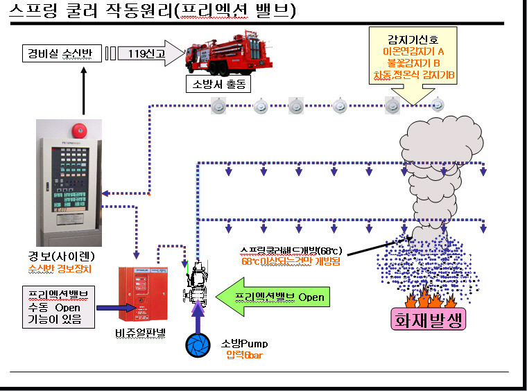 감지기가 열이나 연기를 감지해서 경보를 울리고 밸브를 개방함과 동시에