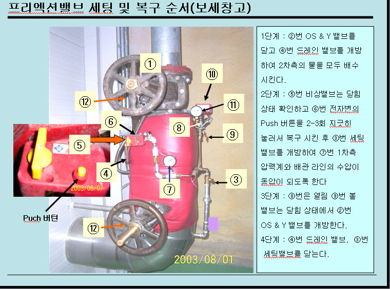전동 볼 밸브 를 개방시킵니다. -화재발생시 감지기의 연동으로 (1) 슈퍼비조리판넬 기동스위치 Push, (2)정전으로 인해 전동 볼 밸브를 수동 개방 : 푸시버튼을 누른 후 레버회전 |