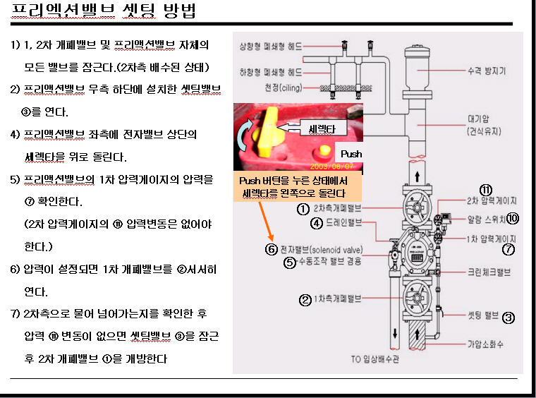 셋팅밸브 ①을 개방하면 1차 압력계만 작동되고 프리액션 밸브 시트가 가압수에 의해 폐쇄됩니다. |