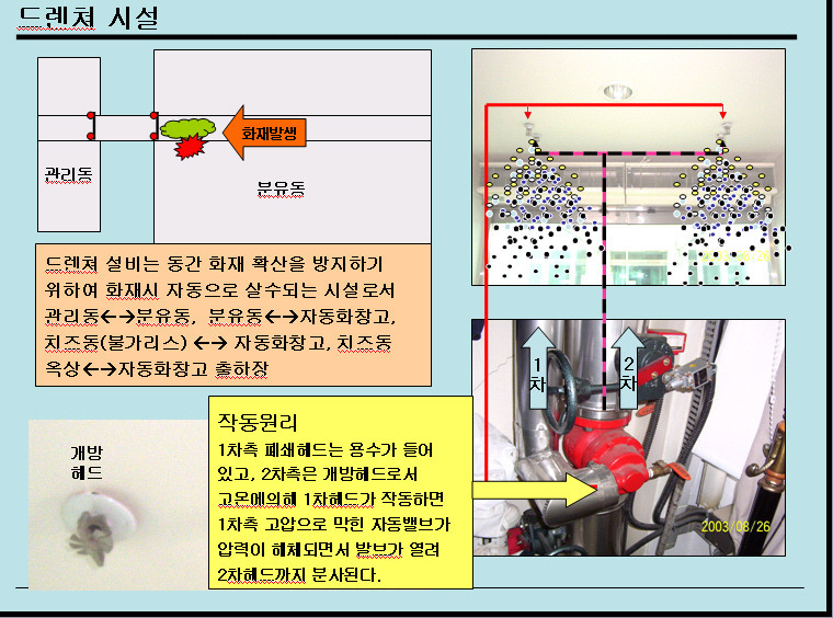 헤드가 열로 인해 작동되면 즉시 물이 분사되어 소화하는 설비입니다.