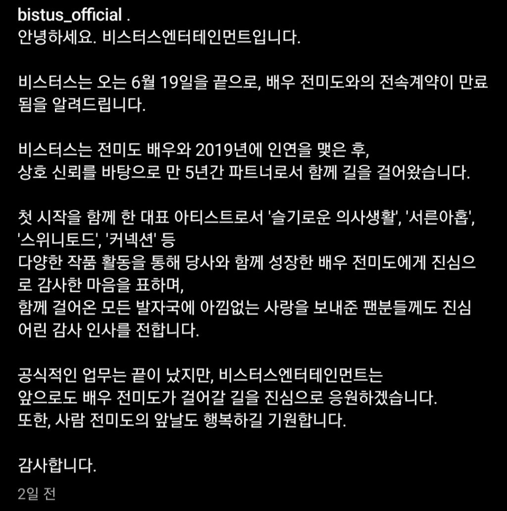 비스터스엔터 인스타 | "비스터스는 오는 6월 19일을 끝으로, 배우 전미도와의 전속계약이 만료됨을 알려드립니다" 작성자다니엘|작성시간24.06.20|조회수309 목록 댓글 0 글자크기 작게가 글자크기 크게가 https://www.instagram.com/p/C8YFx7VSc2s/?igsh=MTl0aXBiOGx0NDkxbg== 다음검색 현재 게시글 추가 기능 열기 북마크 공유하기 신고 센터로 신고 댓글 댓글 0 댓글쓰기 답글쓰기 댓글 리스트
