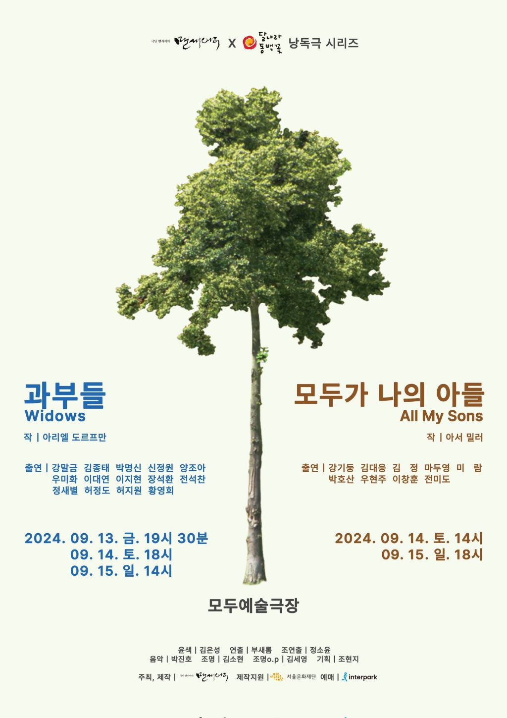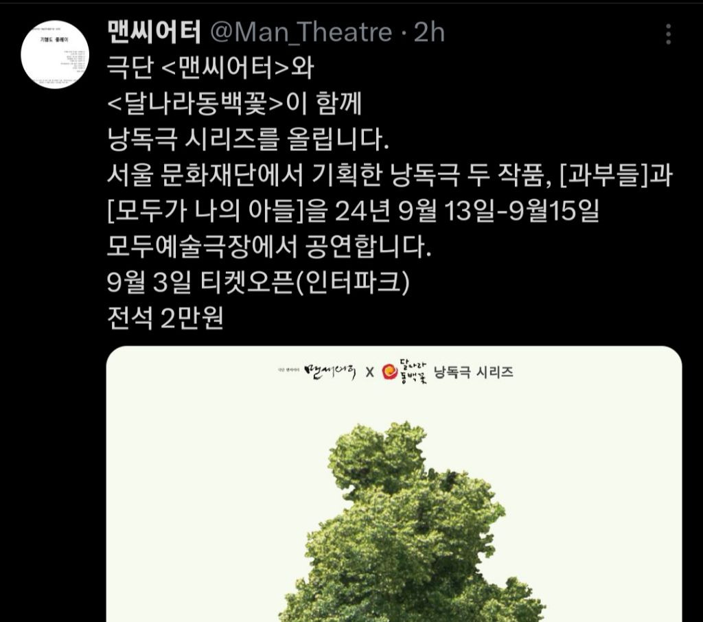 '모두가 나의 아들' 24년 9월 13일 - 9월 15일 작성자다니엘|작성시간24.08.13|조회수319 목록 댓글 2 글자크기 작게가 글자크기 크게가 티켓오픈(인터파크): 9월 3일https://x.com/Man_Theatre/status/1823182230333816976?t=HXeIKlDzMW6pGiFONun7eQ&s=19X의 맨씨어터님(@Man_Theatre)극단 <맨씨어터>와 <달나라동백꽃>이 함께 낭독극 시리즈를 올립니다. 서울 문화재단에서 기획한 낭독극 두 작품, [과부들]과 [모두가 나의 아들]을 24년 9월 13일-9월15일 모두예술극장에서 공연합x.com 다음검색 현재 게시글 추가 기능 열기 북마크 공유하기 신고 센터로 신고 댓글 댓글 2 댓글쓰기 답글쓰기 댓글 리스트 작성자신민지 | 작성시간 24.08.13 헐 작성자김혜빈 | 작성시간 24.08.17 티켓팅 시간은 아직 안나왔나여?? 댓글 전체보기