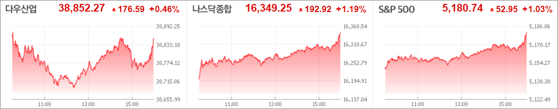 | 다우 +0.46% (38852.27) 나스닥 +1.19% (16349.25) S&P500 +1.03% (5180.74) | |
