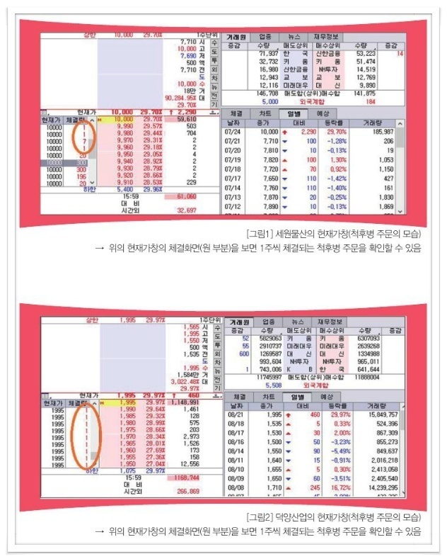 필자는 재빨리 그 종목의 현재가창을 다시 확인하였는데, 놀랍게도 매수잔량은 160만주로 변화가 거의 없었다. “이게 무슨 일인가? 내가 낸 척후병 주문이 체결되었다면, 주문내기 전 이미 깔렸던 상한가매수잔량의 주문이 없어졌을 텐데도 불구하고 그대로 상한가 매수잔량이 160만라니”하며 갸우뚱 하는 순간 순식간에 상한가 매수잔량이 없어지며 상한가가 급격히 무너져 버려 한 10초도 안되는 사이에 5% 이상의 손해를 입은 일이 있었다.