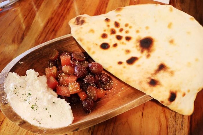 맛은 담백 고소 상큼 3연타 ㅎㅎ 찢어먹는 도우에 치즈와 과일을 올려 싸먹으면 된다