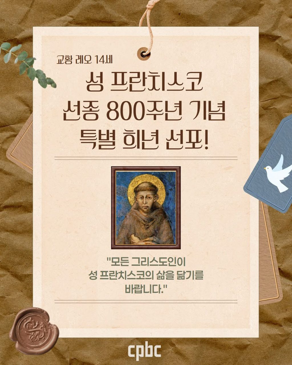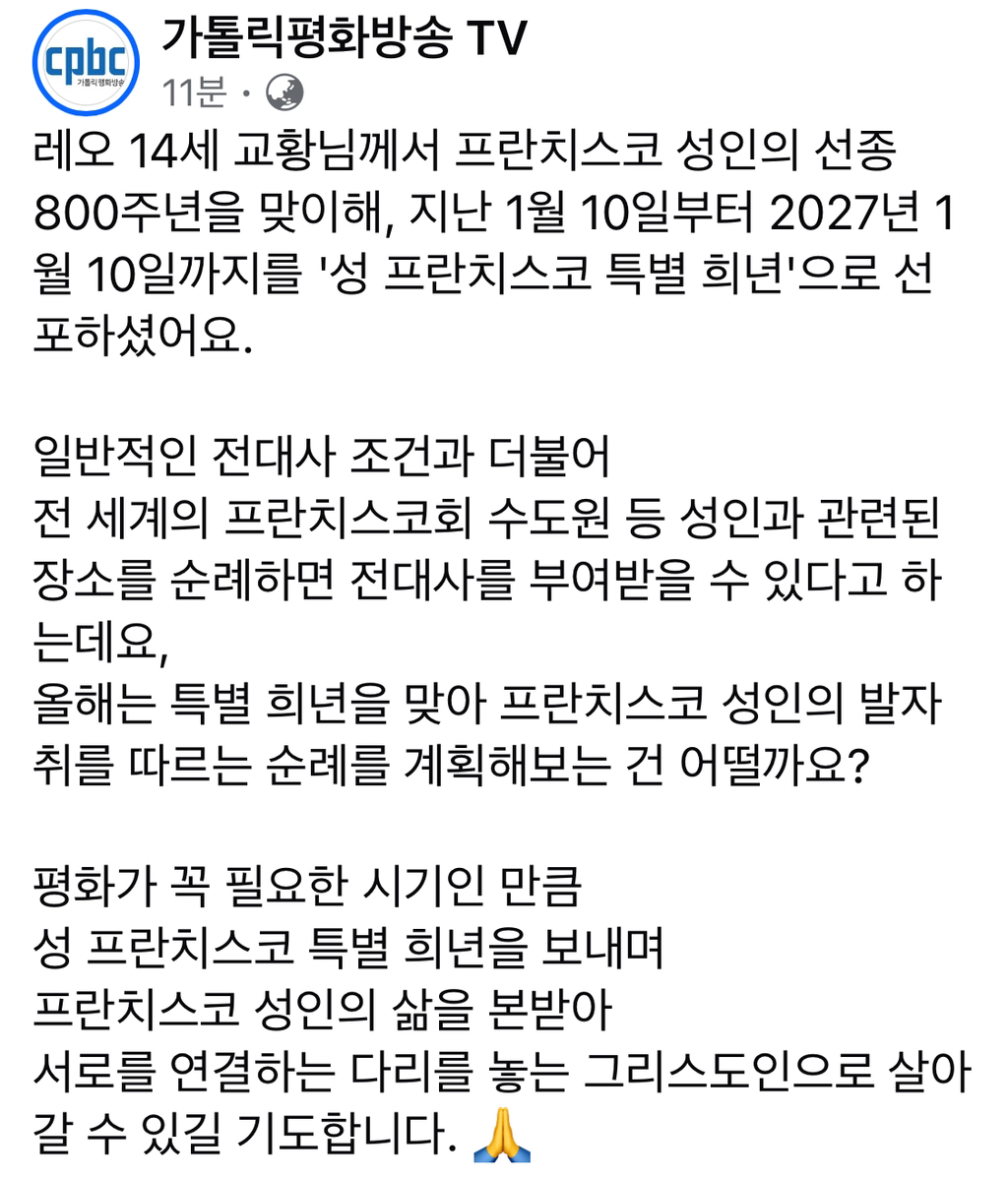 [CPBC] 교황 레오 14세-성 프란치스코 선종 800주년 기념 특별 희년 선포 작성자정금원스콜라스티카(카페매니저)|작성시간26.01.14|조회수91 목록 댓글 1 글자크기 작게가 글자크기 크게가 다음검색 현재 게시글 추가 기능 열기 북마크 공유하기 신고 센터로 신고 댓글 댓글 1 댓글쓰기 답글쓰기 댓글 리스트 작성자이재진클라라(파티마성가대) | 작성시간 26.01.15 🫶 댓글 전체보기