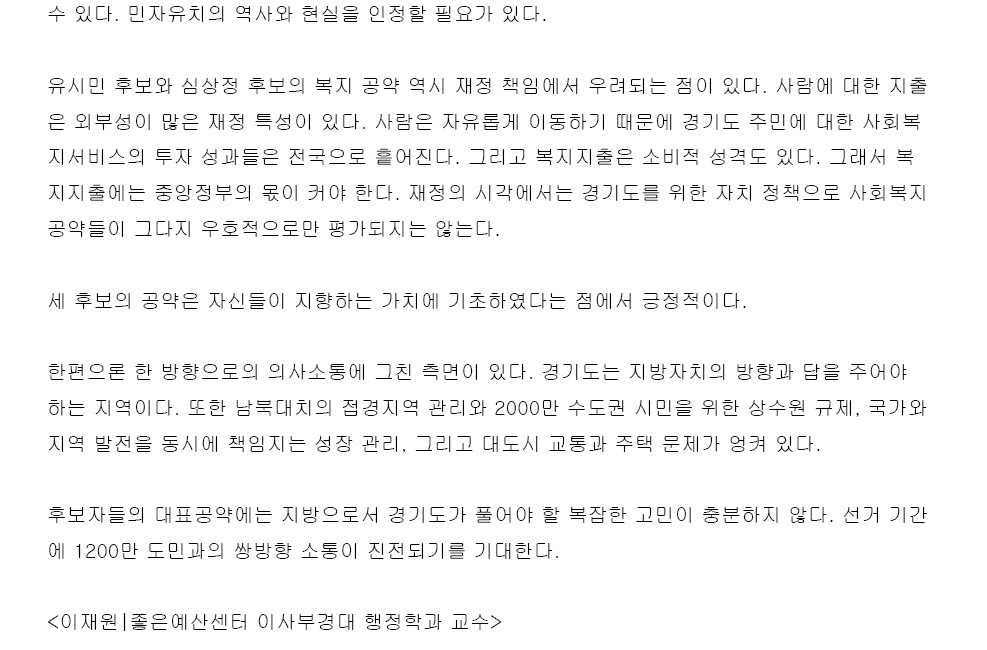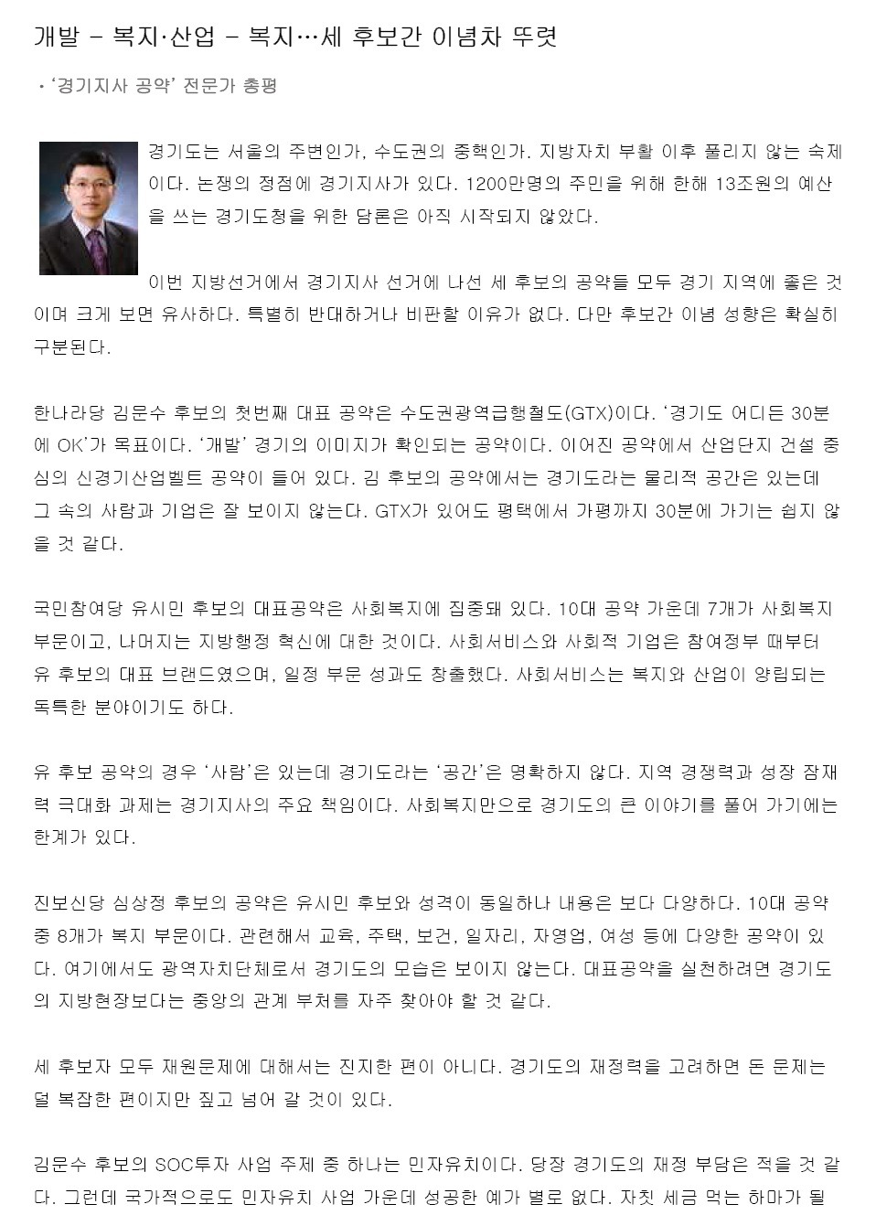 경기지사 공약 전문가 총평 (20100517 경향신문) 작성자손지훈|작성시간10.12.21|조회수42 목록 댓글 0 글자크기 작게가 글자크기 크게가 다음검색 현재 게시글 추가 기능 열기 북마크 공유하기 신고 센터로 신고 댓글 댓글 0 댓글쓰기 답글쓰기 댓글 리스트