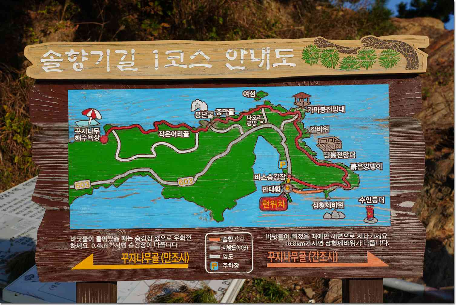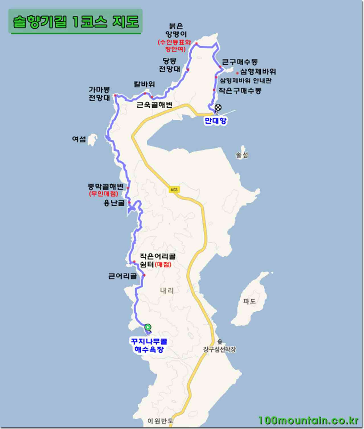 A코스 : 만대항 - 삼형제바위 - 당봉 전망대 - 가마봉 전망대 - 여섬 - 용난굴 - 꾸지나무골 해수욕장 (거리 10.2km / 시간 3시간 30분)