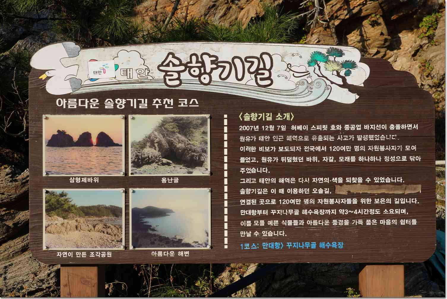 솔향기길은 태안군 이원면 ‘만대항’에서 해안선과 소나무 숲을 따라 백화산에 이르는 아름다운 해안가와 솔숲길을 연결한 도보중심의 길로서, 천혜의 해안경관을 감상하며 피톤치드 그윽한 솔향과 바다내음 숲소리와 파도소리를 들으며 자연에 흠뻑 매료되어 탐방할 수 있습니다.