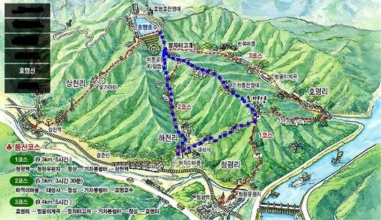 ♣ 산행코스 : 상천4리마을회관 → 송전탑 → 호명호수 → 장자터 고개 → 기차봉(615m) → 호명산 정상 →