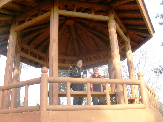 ▶ 산행을 시작한 지 30분이 지난 산 허리 팔각정에는 오늘 처음 함께한 젠틀맨 일행이 미소를 날리고 서있는 모습이 여유롭다.