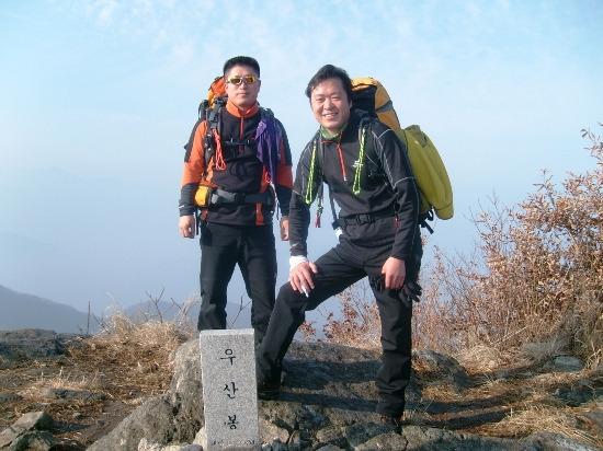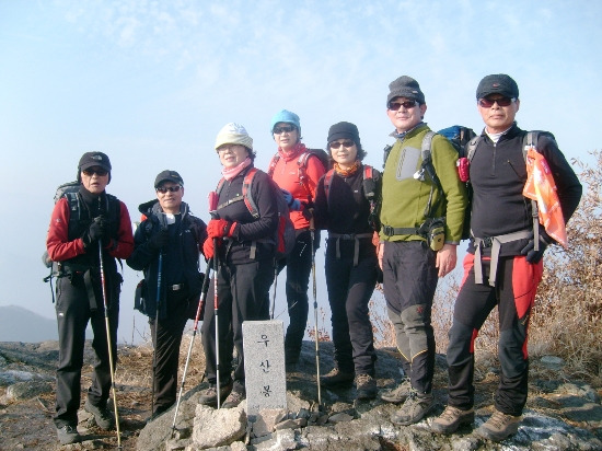 ▶ 오늘 산행의 최고봉인 우산봉 정상이다, 바위로 뒤덮은 정상은 멀리서 보면 우산을 펴 놓은 것 같다고 하여 붙여진 이름이란다. 정감록에 점지된 十勝之地의 계룡산 정기를 타고 행정수도의 웅지를 틀다가 탈색을 기다리