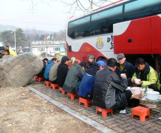 ▶ 모처럼 이른 시간에 산행을 마치고 은어님이 준비한 따끈한 해장국밥으로 허기진 배속을 다스리는 산우들의 모습이 정겹다.