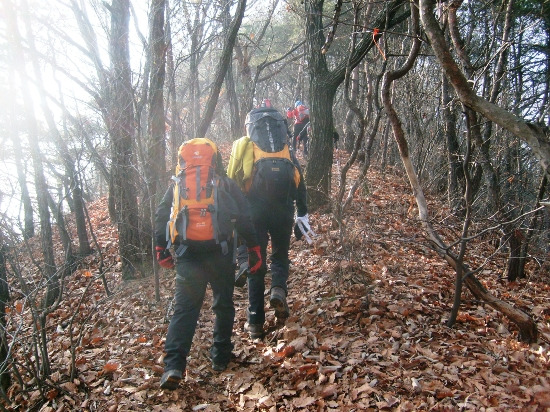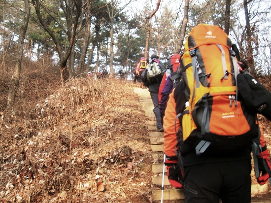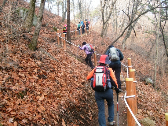 ▶ 낙엽이 분분히 깔려있는 완만한 등산로에는 알맞은 간격으로 나무계단을 설치하고 굵은 밧줄을 느슨하게 매달아 놓아 은근한 충청도 인심이 묻어난다.